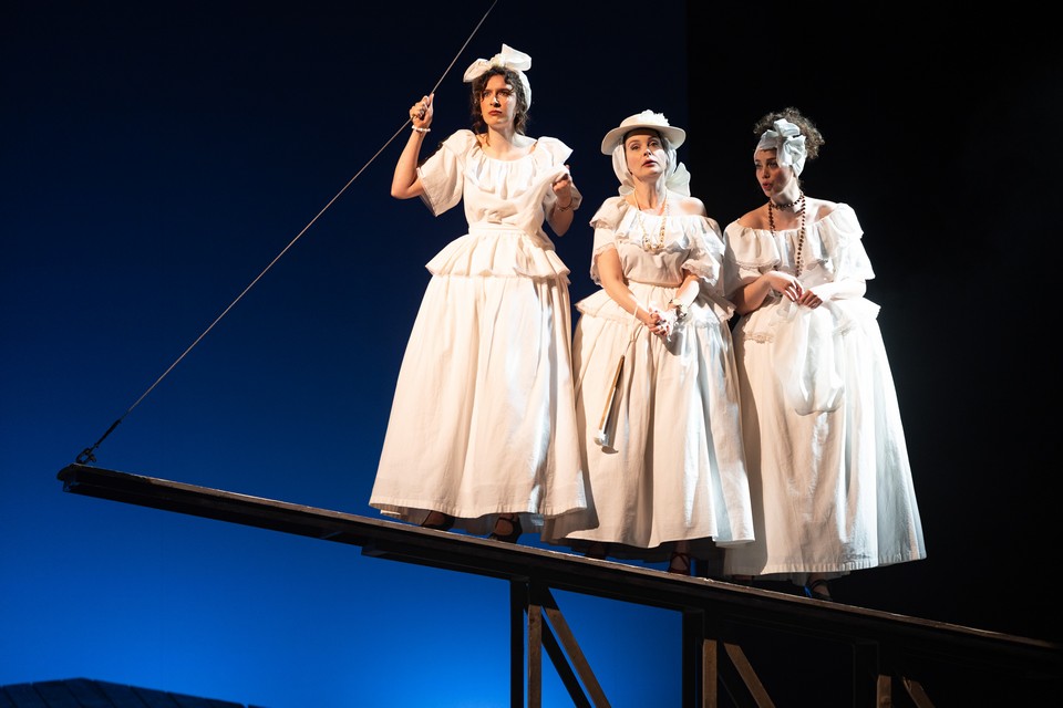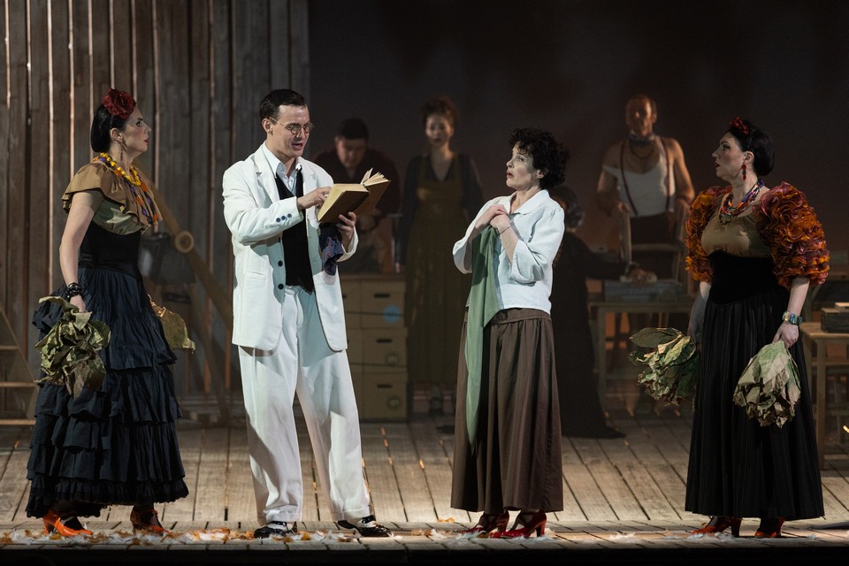 Параллельно с этим на опустившемся из-за кулисы помосте появляются три женщины в белом — жена Сантьяго Офелия (Анна Вартаньян) и две их дочери: юная взбалмошная Марела и серьезная Кончита. Они нетерпеливо вглядываются в даль, ожидая корабль, на котором приплывет лучший в округе чтец, выписанный читать романы рабочим фабрики, пока те крутят сигары. Чтец по имени Хуан Хулиан, которого играет Егор Шмыга, гораздо моложе своего героя в пьесе (у Нило Круза ему 38 лет) и на испанского тезку — Дон Жуана — совсем не похож: добродушный, заикающийся от волнения юноша в светлом костюме смущается вниманием окруживших его девушек. А они и рады с ним шутить — но только до того момента, пока не зазвучит первая фраза романа «Анна Каренина», выбранного для чтения на фабрике, про счастливые и несчастливые семьи. Кокетливые Офелия и Кончита замирают, глядя куда-то поверх голов зрителей: что-то они, замужние, слышат в звучащей фразе трагичное. А между ними восторженно носится Марела, которой роман обещает лишь счастливые переживания любви. Игривое настроение резко сменяется атмосферой лирической грусти.