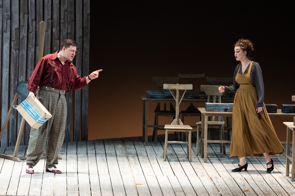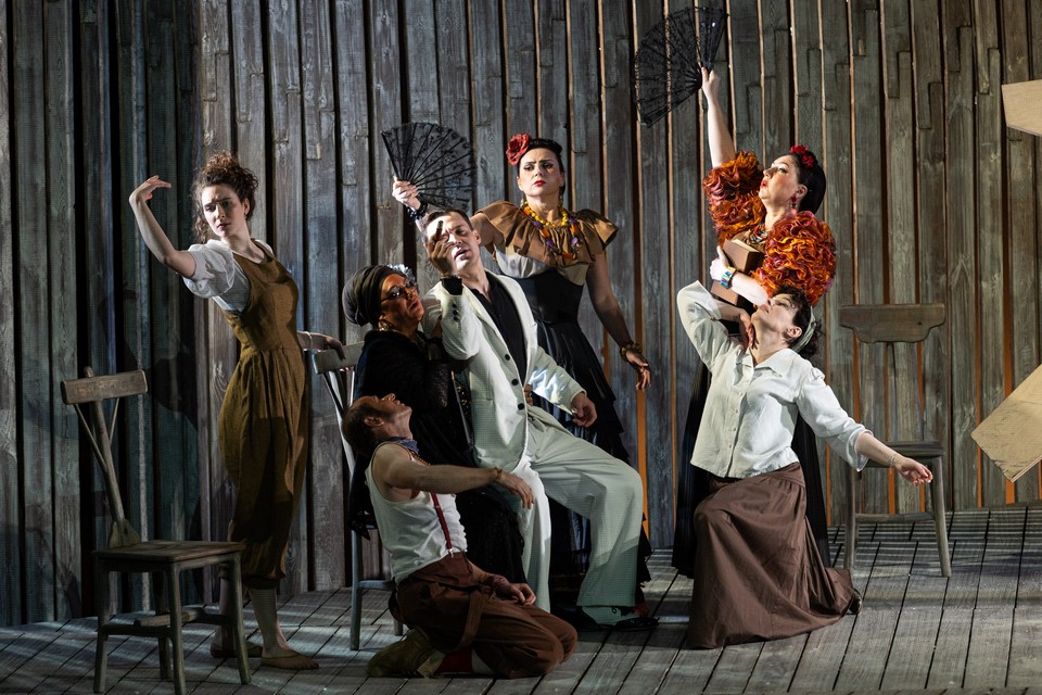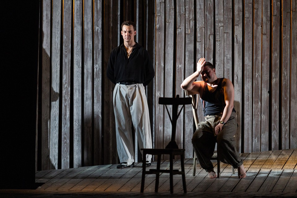 На ярко освещенной сцене атмосфера воскресного дня в маленьком городке, где никогда ничего не меняется. Сценография Эмиля Капелюша: светлый дощатый пол и такая же стена, сквозь которую можно пройти, раздвинув доски, как через лаз в заборе. Сквозь щели льется свет полуденного солнца. Шумно, две девушки в кубинских платьях с оборками машут пальмовыми ветками, как крыльями; летят перья — на авансцене петушиные бои. Хозяину местной табачной фабрики Сантьяго (Богдан Гудыменко) не везет, но, желая отыграться, он берет в долг у своего сводного брата Чече. В пылу обещает отдать ему часть фабрики, если не вернет деньги, и даже вырезает клятву на подошве ботинка Чече.