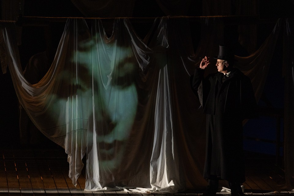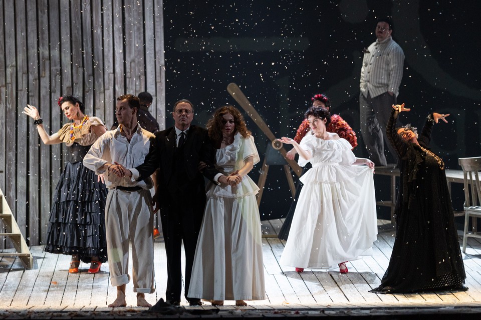 Но книгу необходимо дочитать, ведь «истории надо заканчивать, иначе их постигает та же судьба, что и тех, кто умер раньше срока». Иначе зря являлся героям пьесы мятущийся образ Каренина (з. а. России Евгений Иванов), и откуда бы взяться в жарком мареве полудня завалившему сцену совершенно русскому, совершенно рождественскому снегу, в котором очарованно кружатся ничуть не удивленные, вросшие сердцами в действо романа персонажи пьесы?