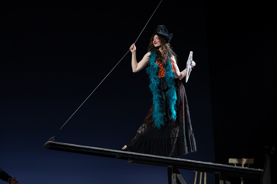 Артисты русского театра играют кубинцев, которым оказались близки герои русского романа, — это могло бы быть интересно в плане создания персонажей. Но Александр Баргман не выстраивает конфликт на взаимоотношениях актера и роли, он сосредотачивается на метаморфозах, происходящих с героями пьесы, и обостряет сюжет введением в спектакль персонажей, у Круза не заявленных. Первая из них — Кармела (Маргарита Бычкова). Она открывает спектакль, появившись перед еще опущенным занавесом словно настоящая кубинка — в длинном черном платье, тюрбане, с нитками крупных бус на груди. Приветствует зрителей на испанском и русском, со вкусом закуривает сигару, и в ее дыму как воспоминание возникает история, произошедшая в маленьком городке во Флориде среди выходцев с Кубы. Кармела в сюжетных перипетиях не участвует, но почти в каждой сцене — с неизменной сигарой — с грустью и сочувствием наблюдает за персонажами.
