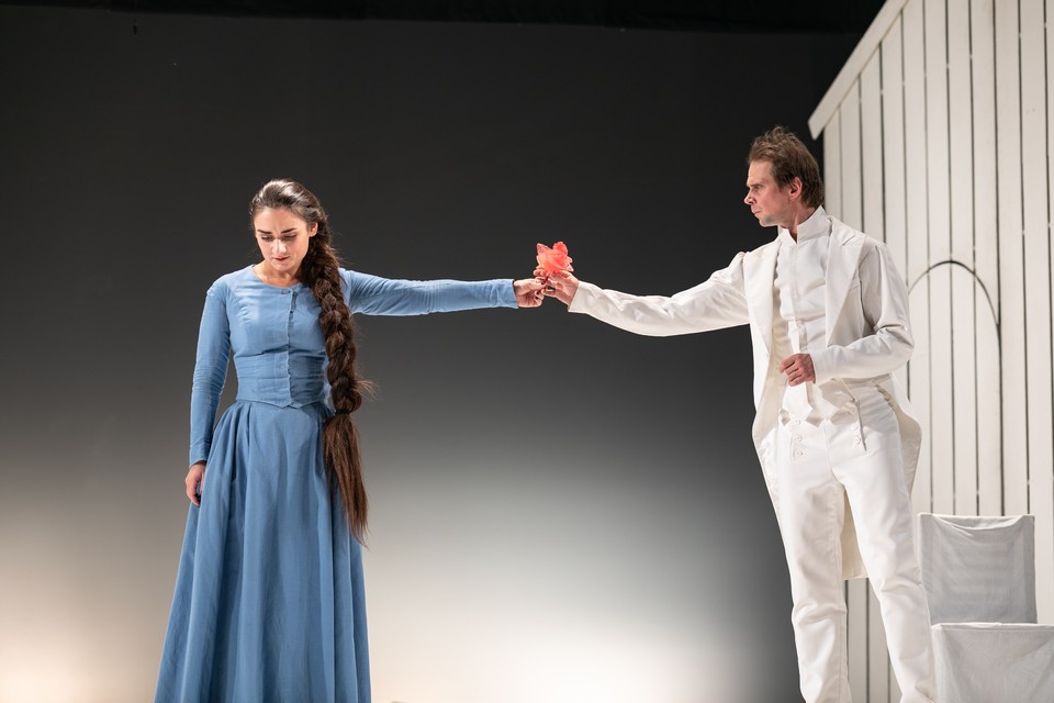 Поскольку Светлана Иванова-Сергеева начинала как актриса театра «Практика», где идет исключительно «новая драма» — своя и зарубежная, то и став режиссером, от выбора своего не отказалась. Минималистичная сценография Дмитрия Разумова (две двигающиеся туда-сюда дощатые ширмы, длинный, приземистый стол на колесиках, несколько стульев – собственно, и всё) позволяет зрителям сосредоточиться на актерах, тексте и действии. С первыми, правда, пока есть трудности. Поскольку не у всех исполнителей, задействованных в «Сердце», опыт работы с «новой драмой» так уж велик, то и играют они эту историю всё больше как сказку для детского утренника, пока лишь подбирая ключи к своим партиям. Разумеется, история, сочиненная немецким романтиком – не обычная сказка. Это смесь притчи и легенды, повествующая о юноше, обменявшем свое горячее сердце на золото. И, безусловно, с трагической тональностью – как меняет человека внезапно свалившееся на него богатство, какие свойства натуры проявляются. Мечты сбылись, однако Петер, хоть и ходит нынче весь в белом, все равно несчастлив. Его попытки наладить новую жизнь обречены на провал. Родная мать (Ольга Арикова) будет изгнана со двора, вслед за ней отправится Стеклянный человечек (Денис Пьянов), от петеровой руки погибнет нежная и трепетная Лизбет (Варвара Светлова). Впрочем, даже романтики не всегда завершали свои рассказы безнадежным финалом. И потому классическое «спасение в последнюю минуту» здесь все-таки происходит. Петеру дают шанс переиграть все назад. Правда, теперь уж навсегда. На что он соглашается без трепета и сомнений.