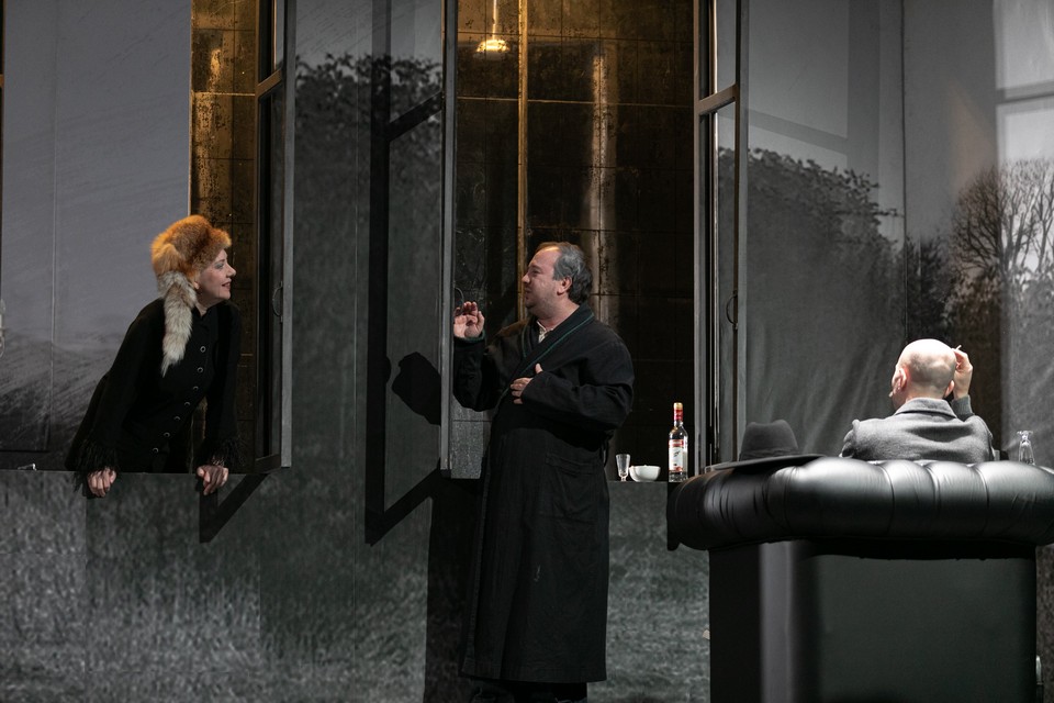 Но только живой организм дома свою энергию людям передать не в состоянии. Ведь все миражи запрятаны в них глубоко внутри, и прекрасное пространство с Мане и вибрацией природы они не замечают, как не замечают и находящегося среди них «чёрного человека». А в реальности живут в каком-то сером мире, где повседневность их покорила, а «чувства притупились». Об этом говорят их костюмы (художник Елена Жукова), на редкость бесцветные, хотя и здесь не без гротеска — гигантская в пол шуба Серебрякова и неснимаемая меховая шапка и кроссовки Марии Васильевны. Но при помощи Helenе режиссёр вырывает их из тоскливой обыденности, правда, только на мгновенья. Но какие мгновенья! Дяде Ване удаётся не только говорить Елене о любви, но ещё и обнять и даже поцеловать. И в этот момент происходит эмоциональный переворот среды спектакля. В спокойный пейзаж стены внезапно вторгается ещё одно — самое большое — дерево и начинает ходить ходуном, на этих же стенах загораются светильники, о присутствии которых мы и не догадывались, как оборвавшийся парус вылетает штора из окна. Такой же взрыв происходит в момент поцелуя Елены с Астровым и явления потрясённого дяди Вани с букетом красных роз, который стал самым цветным пятном в спектакле. Правда, здесь ещё добавилась и оперная страсть — финальный крик Канио из оперы Леонкавалло «Паяцы». А у Астрова, кроме Елены, есть любовь к природе, и она в спектакле овеществлена, это огромное, но прозрачное животное, вылепленное из белых лент с головой оленя. На нём стоит всё тот же «чёрный человек» и произносит монолог о природе. Правда, накануне выясняется, что он стрелочник, умерший у Астрова под хлороформом.