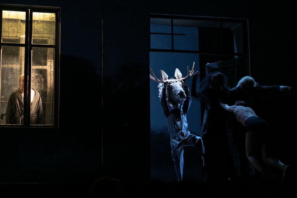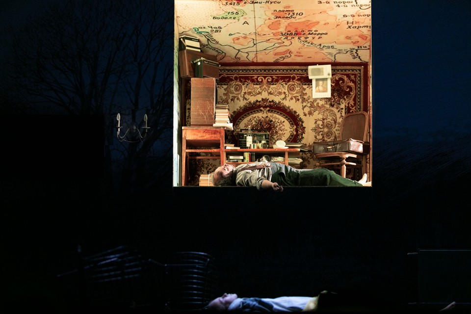 Иллюзорность присутствует здесь везде. В самом устройстве дома, внешние стены которого словно развернуты пейзажем внутрь (сценография Анвара Гумарова). В этом доме стены — воображаемый конструкт. Одна из них может даже перемещаться и делить пространство на несколько площадок, но даже когда ее нет — невидимые линии словно прочерчены на сцене. Стен нет, но их наличие обыгрывается. И в этом смысле обращенный в себя сновидческий ландшафт мощно поддерживает заданную в самом начале потустороннюю атмосферу, когда брошенный Марией Васильевной в пространство звук откликается вдруг вспыхнувшими светильниками и протяжным, внеземным эхом (композитор Владислав Крылов).