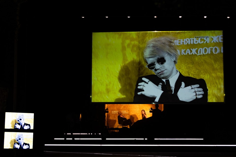 На сцену Театра им. В. Ф. Комиссаржевской он занес Богдана Гудыменко — Барона, который по всем приметам был художником: Гудыменко примерил на себя образ, в котором читается Энди Уорхол, — первый раз он появляется на сцене полуобнаженным, с перебинтованным торсом (визуальное повторение известного фотопортрета Уорхола, сделанного Ричардом Аведоном), когда уходит в телестудию — надевает светлый парик с торчащими в разные стороны колючими волосами, которые периодически приглаживает.