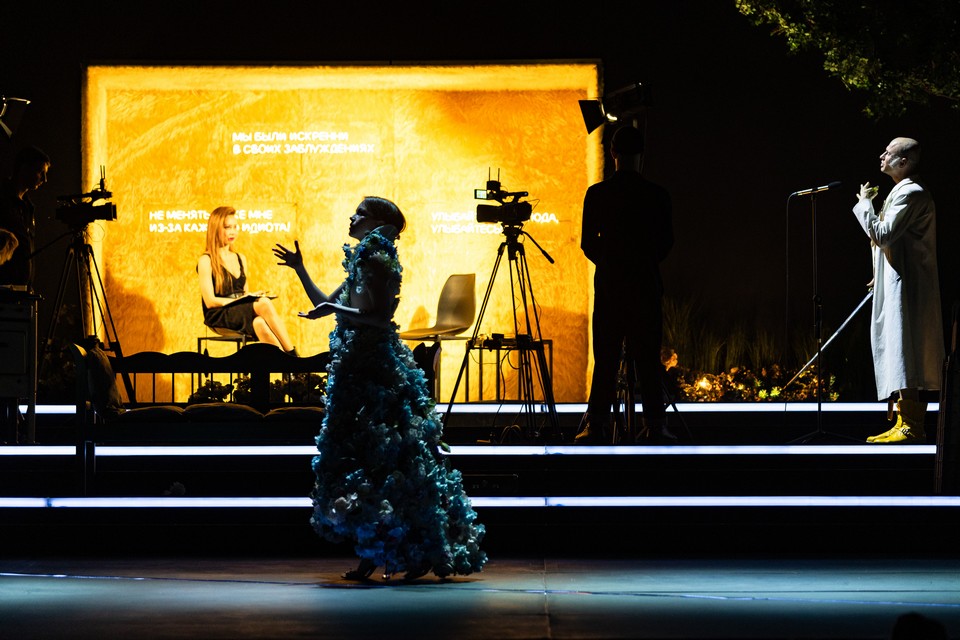 По задумке режиссера, должны были соединиться два измерения: театральное и медийное. Но столкнувшись, они дали трещину — фундамент треснул. Красивое выстроенное Анваром Гумаровым сценическое пространство стало многомерным, но не перетекающим, а сбоящим, склеенным по частям, превратившимся в водоворот пошлости: когда смерч несется, он затягивает в себя все без разбора.