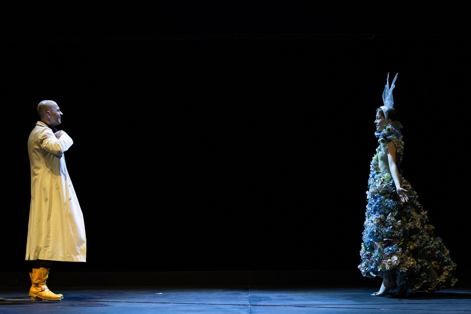Марта (София Большакова) в этом спектакле кажется куклой или роботом в подвенечном платье из цветов. Язык общения глухонемой девушки – жесты. Даже ее постоянно повторяющийся танец под лейтмотив спектакля — песню Софии Ротару «Луна-луна» кажется машинальным и бесчувственным, хотя в тексте песни говорится не только о цветах, которых в постановке немало, но и о том, что «часто в жизни не хватает друзей и доброты».
