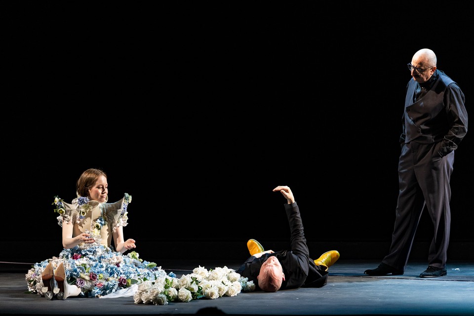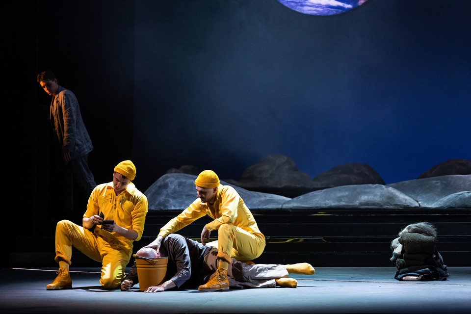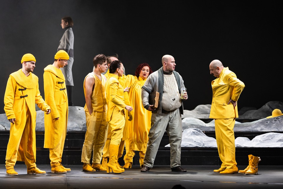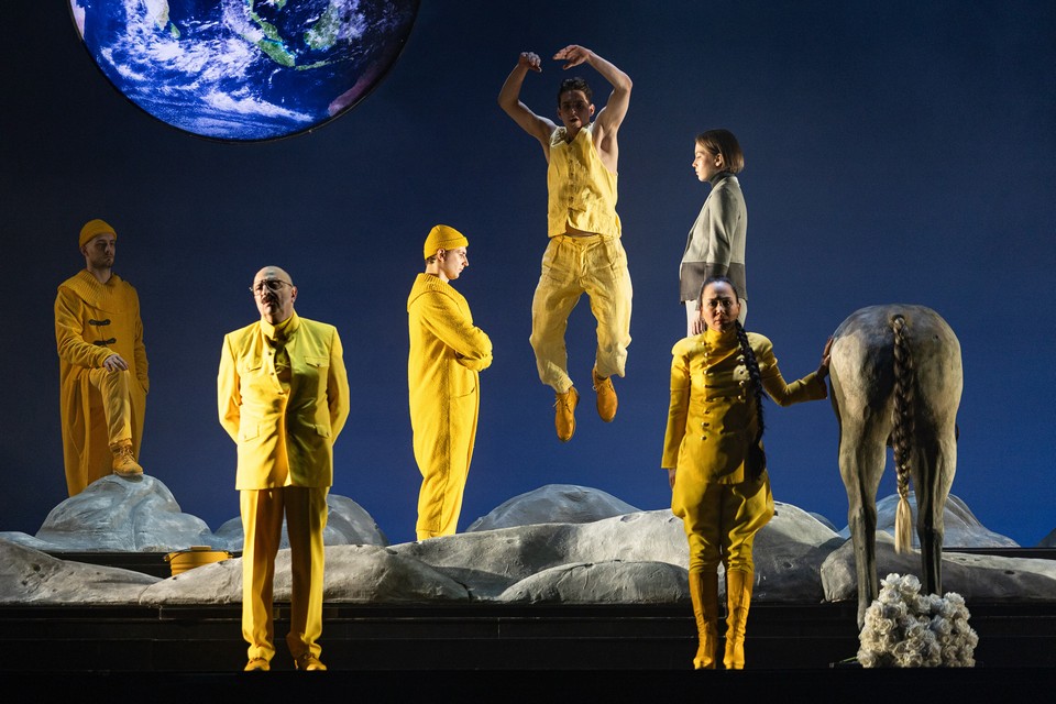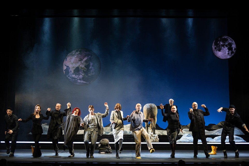 «Мир сейчас не имеет смысла» — лозунг постановки, в которой ко второму действию происходит окончательный переход к авангарду. Словно модели видеопортретов (voom portraits) Роберта Уилсона, персонажи спектакля либо замирают в статике на фоне Земли и Луны, либо медленно двигаются. В этом новом определении пространственно-временного континуума все получает иное звучание: здесь можно дирижировать оперой, в которой вместо музыки тишина, а потом обнажать не только тело, но и душу.