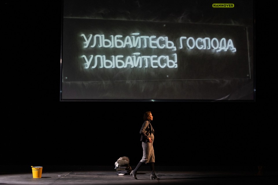 В конце спектакля, так и не вернув свою личность, барон в прямом эфире поет что-то беззаботное про love, несмотря на направленное на него дуло хлопушки. Беспокойный взгляд. Выстрел. Разлетается разноцветное конфетти. На экране неоновая надпись, попавшая в опустевший кадр: «Улыбайтесь, господа, улыбайтесь!».