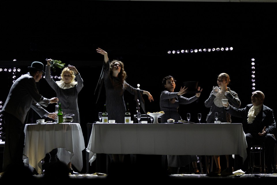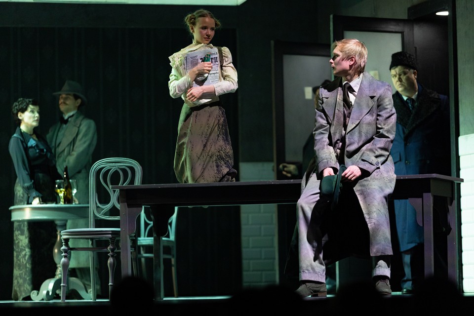 Поглощенность персонажей литературой порой подсвечивается иронией. В поезде случайные попутчики обсуждают Тургенева, и корпулентная дама, бывшая смолянка, а ныне детская писательница Агния Павловна (колоритная Маргарита Бычкова), рекомендует своей юной визави (Варя — Мария Когутницкая) обратить внимание на роман «Дым», ведь там речь об историческом пути России!.. Перевод сказки Кэрролла про Алису в Стране чудес (у Набокова — «Аня в Стране чудес») тоже приписан в спектакле героине Бычковой. Во втором акте начинается фантасмагория, вверх улетают стены пансиона, и персонажи в котелках и цилиндрах, воротниках-фреза и жабо усаживаются за застеленный белоснежной скатертью стол. Бегает туда-сюда Аня — София Большакова в изумрудном платье и островерхой шапочке. Конечно, это безумное чаепитие, «сумасшедшие пьют чай». Они говорят о времени, с которым поссорились и которое теперь их наказывает: часы всегда показывают время чая. Оказывается, это читка нового перевода, домашний спектакль к Рождеству.
